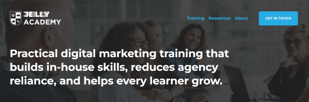 Jelly Academy runs an online bootcamp to teach people how to do real digital marketing work. Over about ten weeks, students learn social media strategy, SEO, paid ads, email marketing, and public relations. The course is hands-on, meaning learners complete tasks that are similar to actual marketing campaigns.
