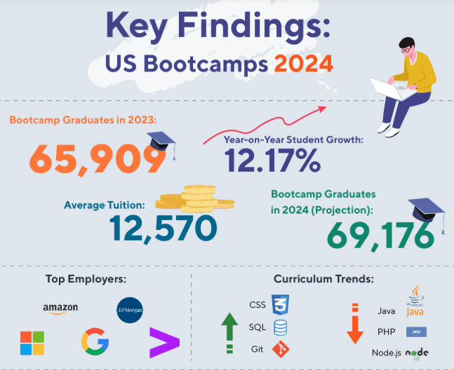 Digital marketing bootcamps are growing rapidly in popularity. In 2023, over 65,900 students graduated from US bootcamps, with enrollment increasing by 12% year-on-year. The average tuition is $12,570, and projections suggest nearly 69,200 graduates in 2024.