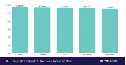Across the top-performing U.S. regions — including Texas, Colorado, DC, California, and New York — these AI-generated summaries appear at a remarkably consistent rate of approximately 27.75% to 28.66%.