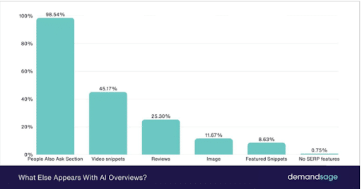 The “People Also Ask” section is nearly universal, appearing with 98.54% of AI Overviews, followed by video snippets (45.17%), reviews (25.30%), and images (11.67%).