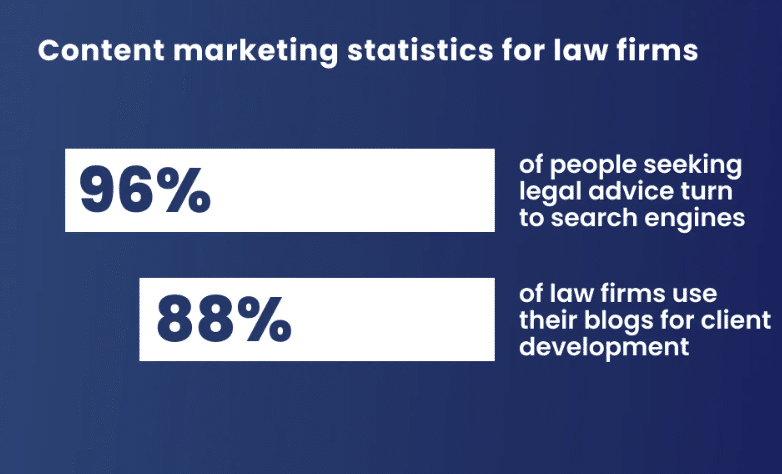 Look at the stat above — around 96% of people seeking legal advice start with search engines, and a large majority of law firms already use their blogs for client development.