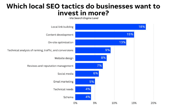 Industry survey data shows that local link building is the top local SEO tactic businesses want to invest more in — even above content and on-site optimization.